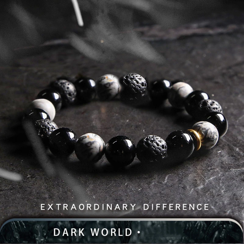 Dark Series Natural Black Onyx Volcanic Rock Map Stone Beads Bracelet Homme Copper Accessories Lava Jewelry for Women Pulsera