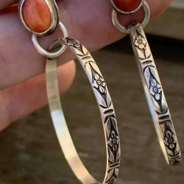 Vintage Square Coral Stone Drop Earrings Ethnic Jewelry Silver Color Metal Carving Pattern Round Dangle Earrings for Women